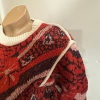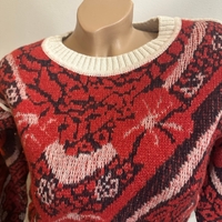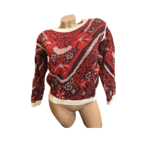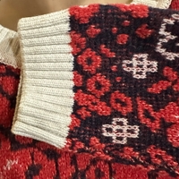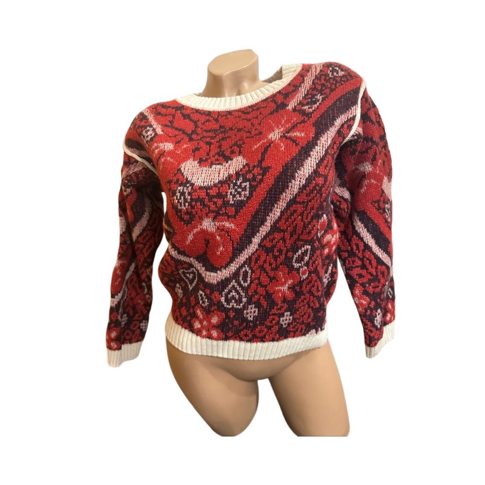 Vintage-style red patterned knitted crewneck sweater, ribbed trims.