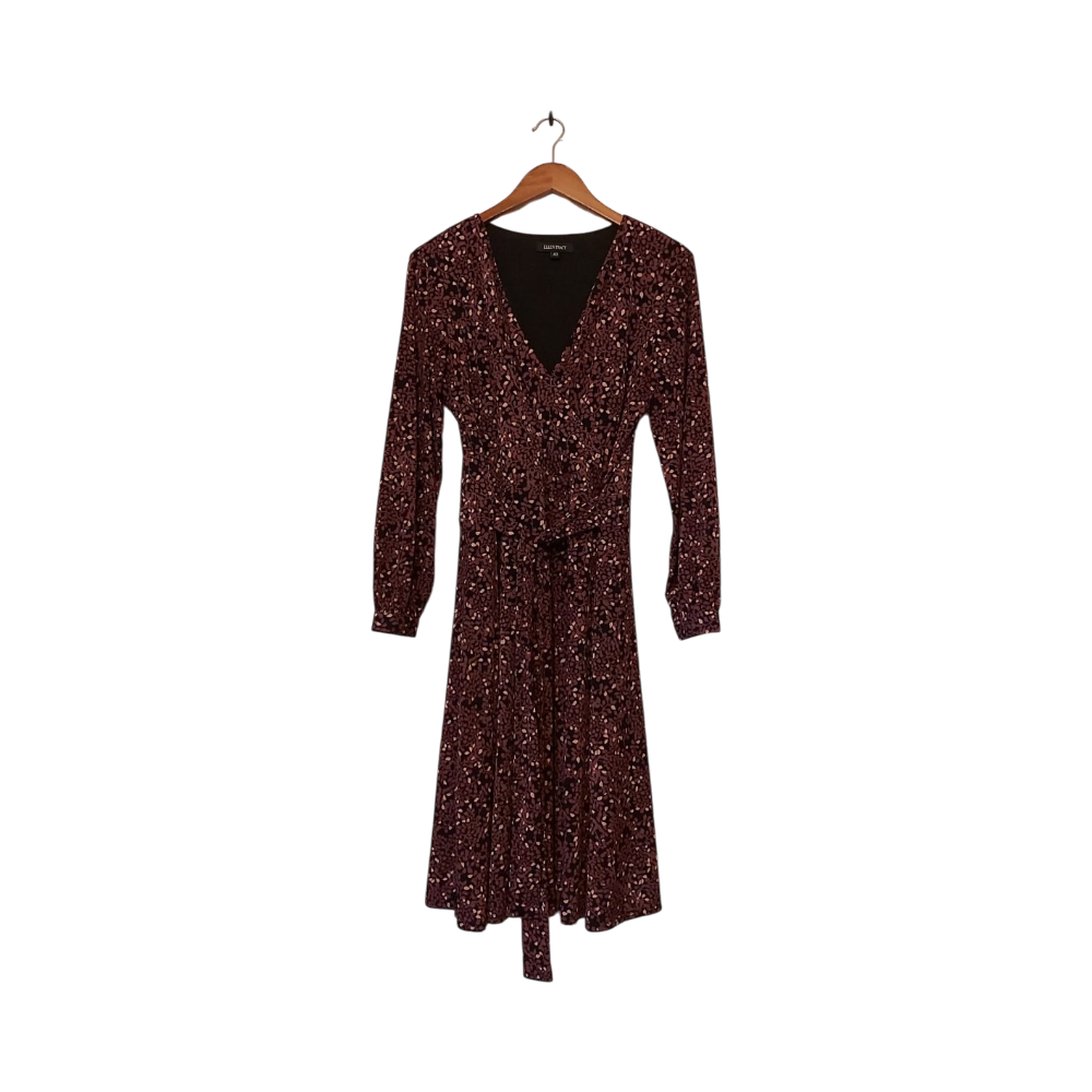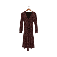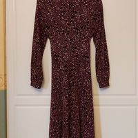 Pitkähihainen midi-mittainen kukkakuvioinen mekko. Edessä kiinni vyö kietaisumallia varten.