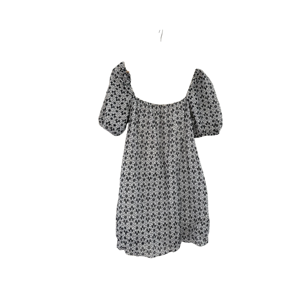 Valkoinen mustalla kukkapainatuksella, lyhyet pussihihat.