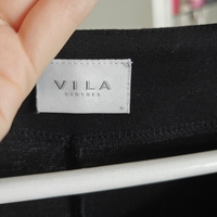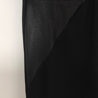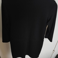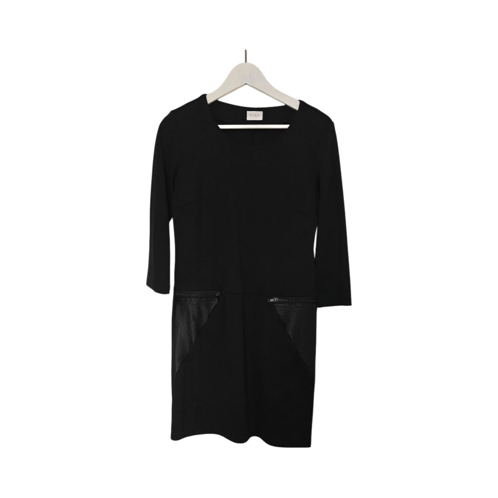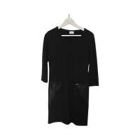 Yksinkertainen musta mekko, keinonahkaiset taskut ja 3/4-hihat. Koko S