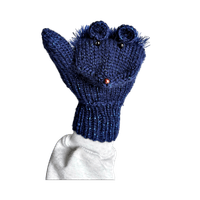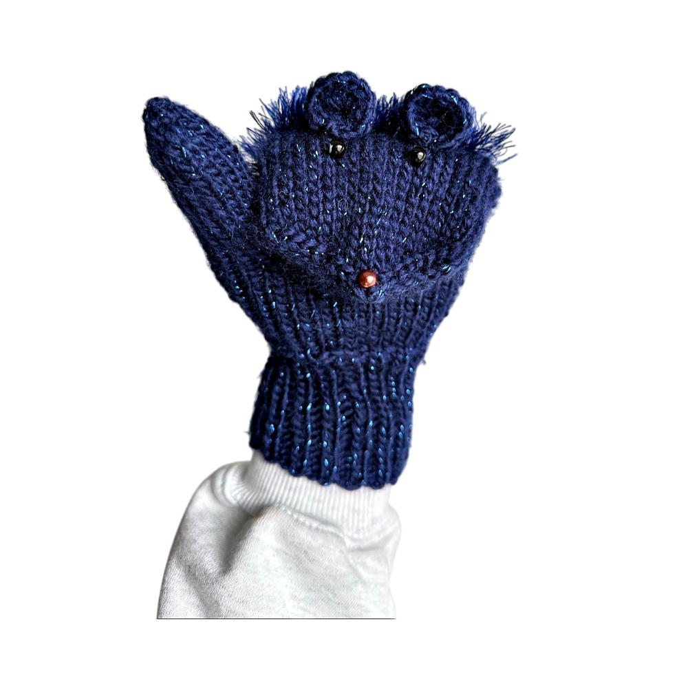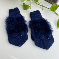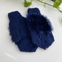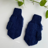 Käsintehdyt tummansiniset/kimaltavat siililapaset. Kämmenosan pituus 16 cm ja koko lapanen 24 cm. Lanka 60 % akryylia ja 40 % villaa.