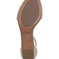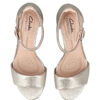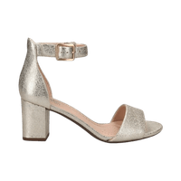 Metallic block-heel sandals with ankle buckle strap. Comfortable cushioned insole. Unused.