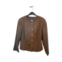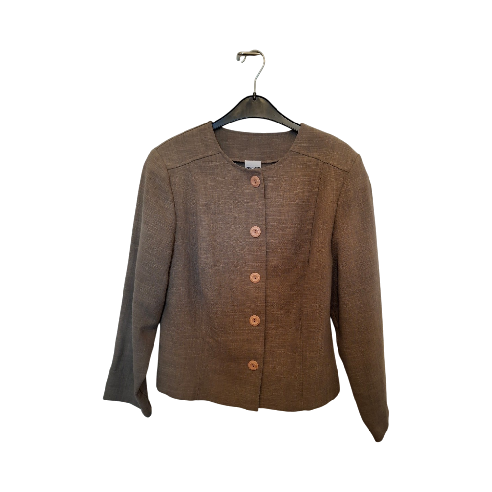 Lyhyt, tumman beigen (ehkä mukana vivahdus vihreää) sävyinen naisten jakku. Olkatoppaukset.