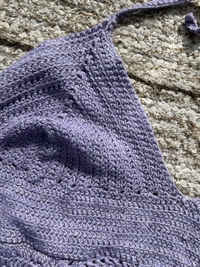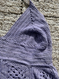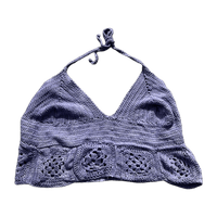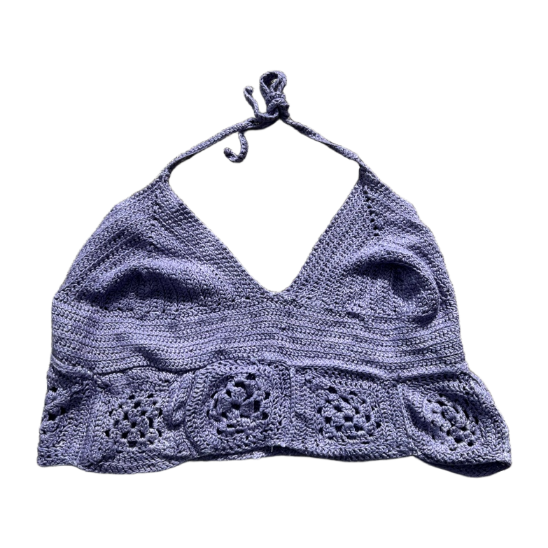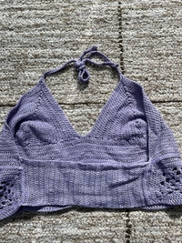 Liila virkattu lyhyt toppi, todella siistissä kunnossa. Sopii arviolta koossa m. Pituus noin 40cm ja kai kai mitta 46cm.