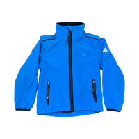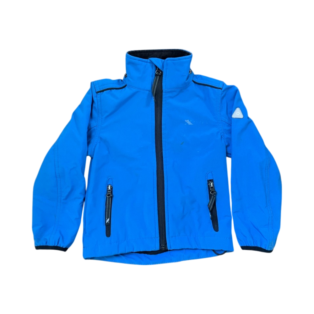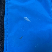 Lightweight blue softshell jacket with zip pockets, some stains.