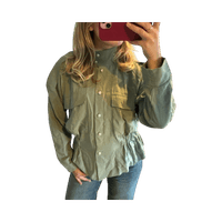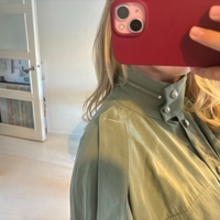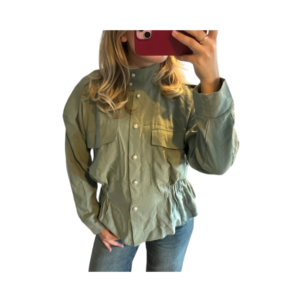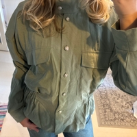 Vihreä kevyt takki, vyötäröllä kiristys, napit edessä. Kokoa xs