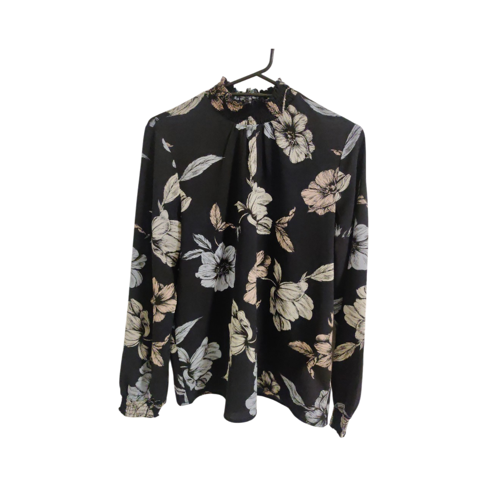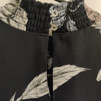 Pitkähihaisen puseron korkea smokkikaulus, kevyt kangas. Tyylikäs paita arkeen housujen tai puolihameen kaveriksi. Hajusteeton pesu, ei lemmikkejä eikä tupakointia.
