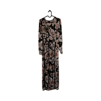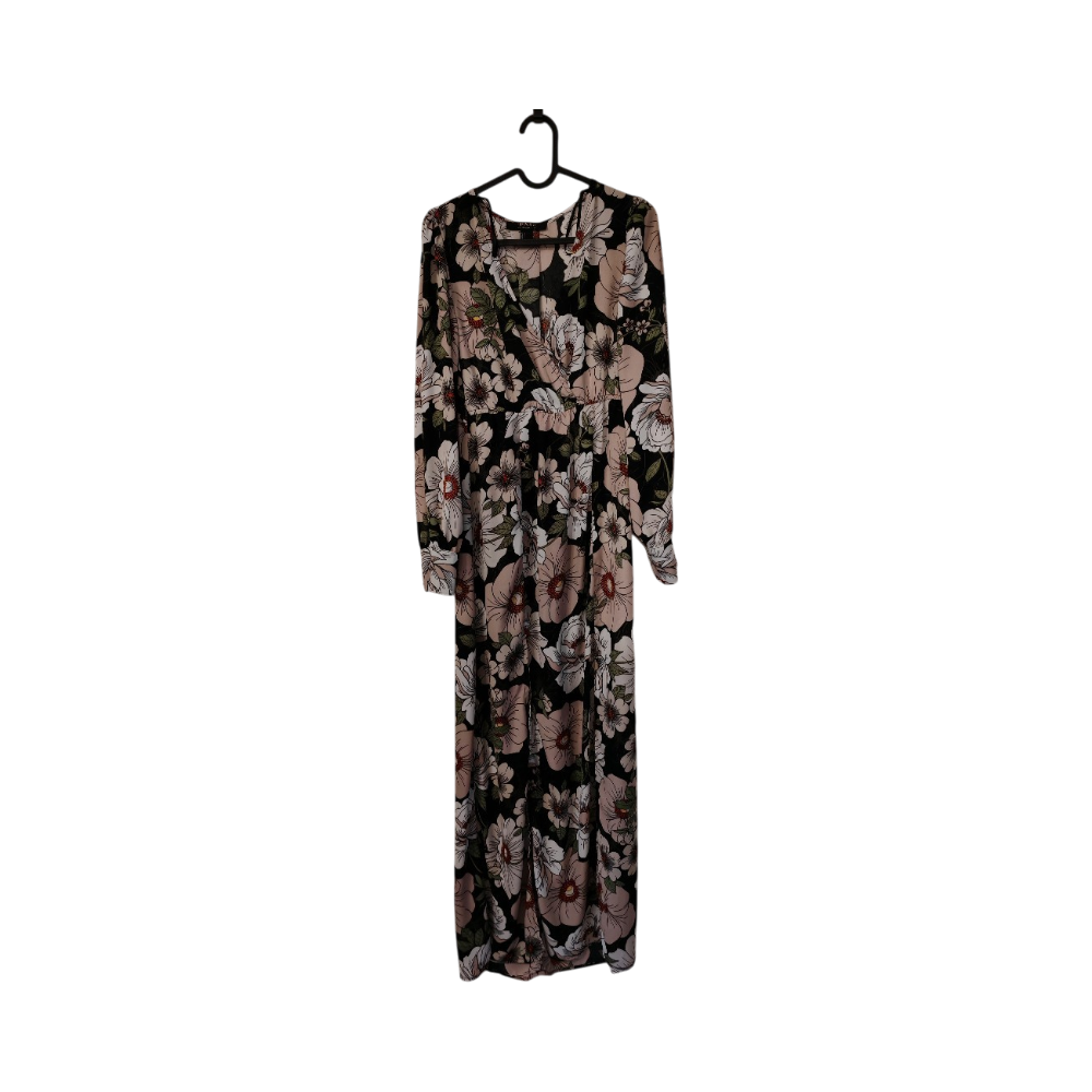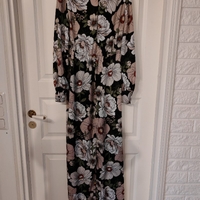 Pitkä, kukkakuvioinen maksimekko, pitkähiha, helmassa halkiot.