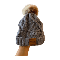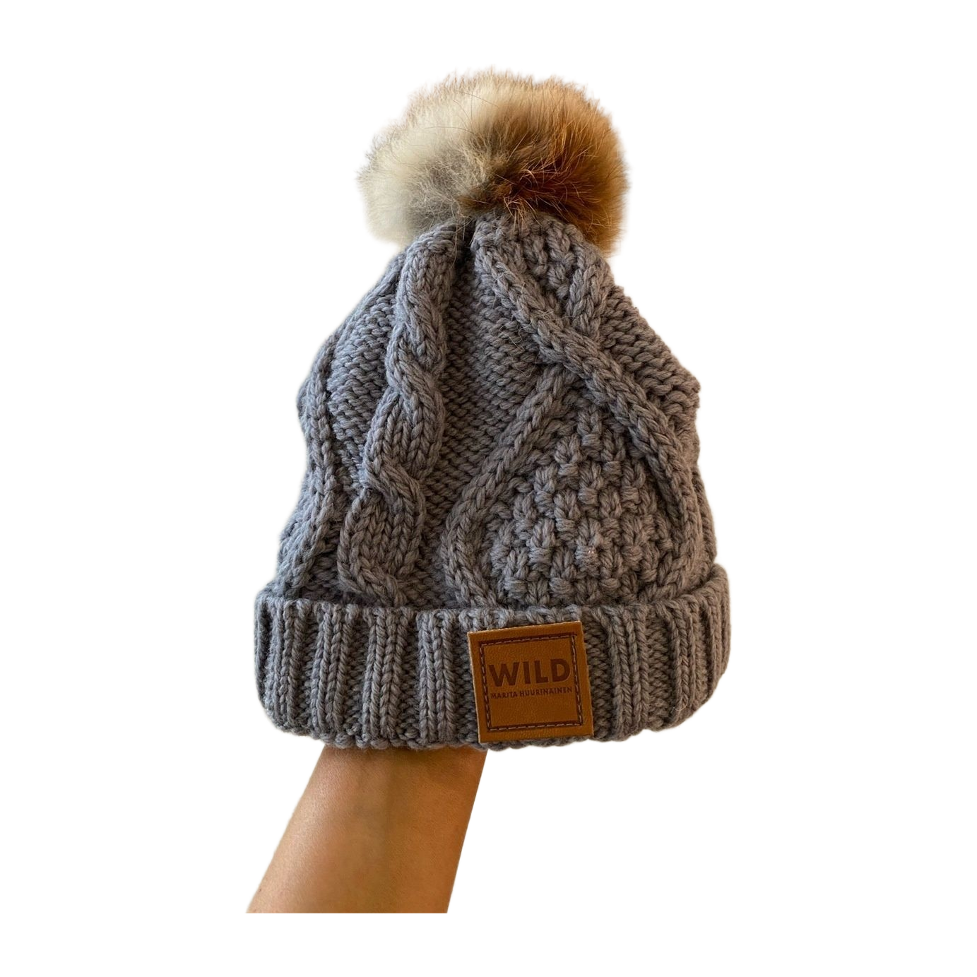 Marita Huurnainen Wild cable knit harmaa villapipo turkistupsulla.