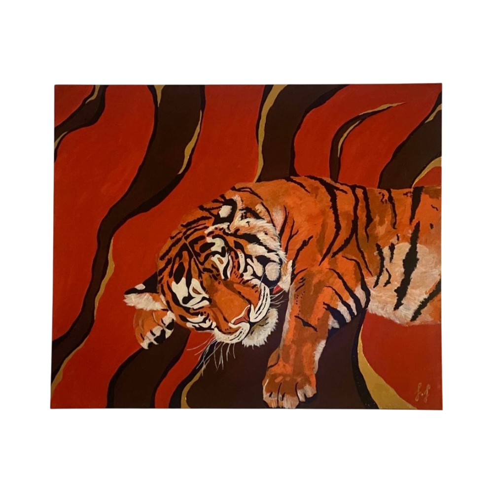 Myynnissä ainutlaatuinen akryylimaalaus kankaalle, jossa lepäävä tiikeri yhdistyy voimakkaan väriseen abstraktiin taustaan.