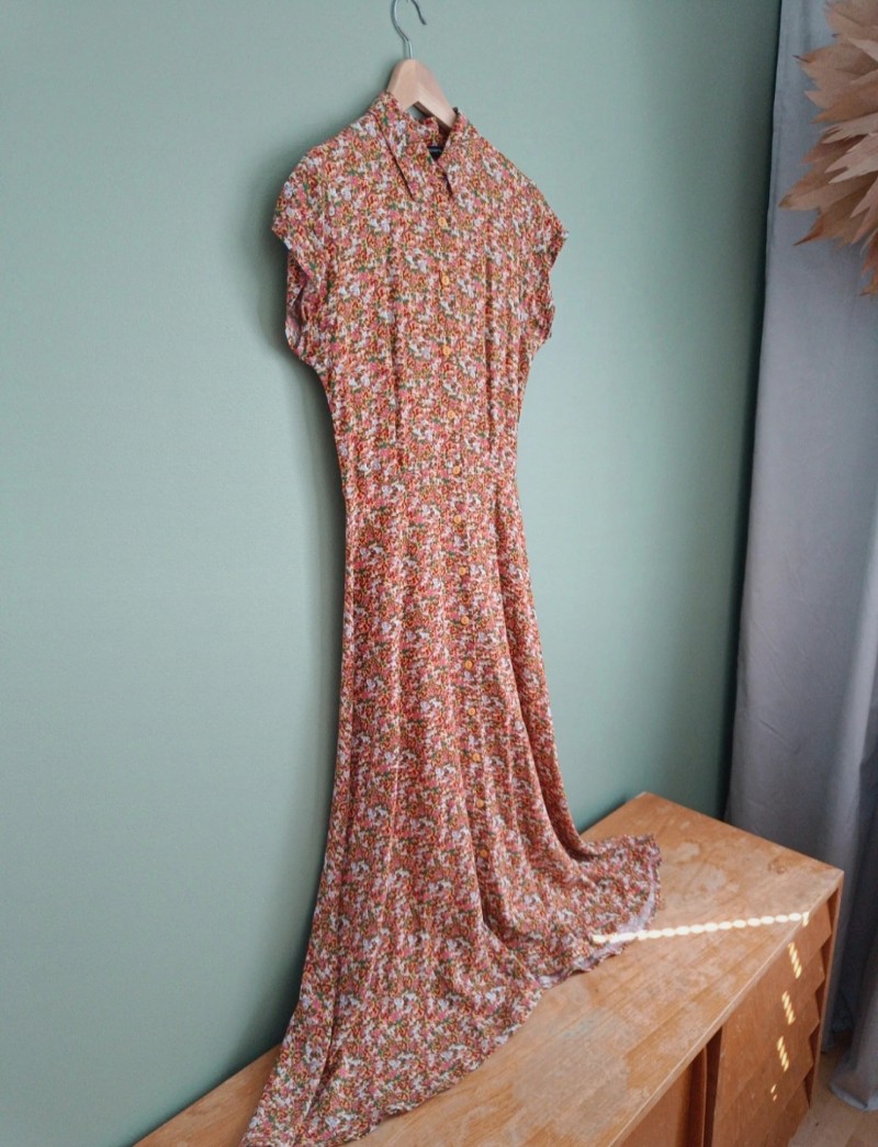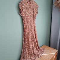 Maksimekko alas asti avattavilla napeilla. Kuosi näkyy lähikuvissa parhaiten. Kainalo-helma n 105cm, kainalo-kainalo n 42cm, vyötärönympärys n 66cm. Materiaalilaput leikattu pois, mutta viskoosille tuntuu.
