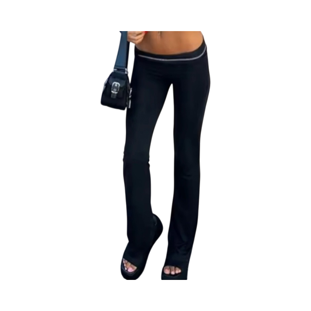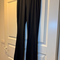 Mustat korkea vyötäröiset flared-leg legginssit, koristekirjoitus takana.