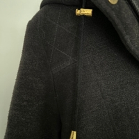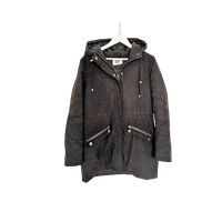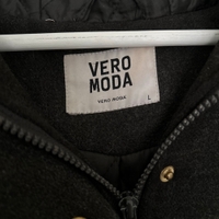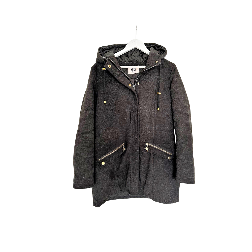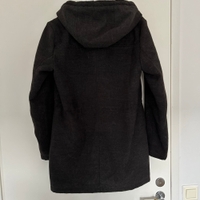 Harmaa vuorellinen villakangastakki, hyvässä kunnossa. Vetoketju ja napit edessä sekä taskuissa. Kiristysnauha vyötäröllä.