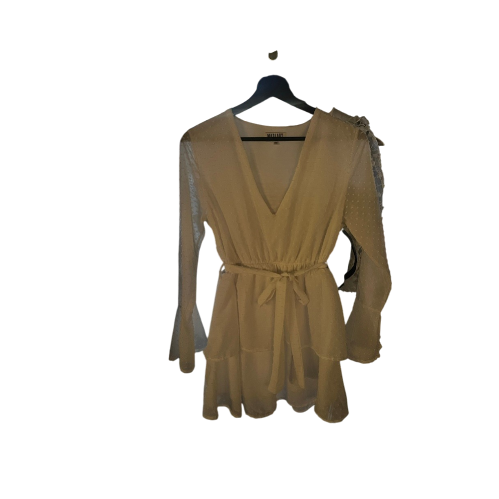 Valkoinen pitkähihainen mekko vyöllä, kevyttä kangasta.