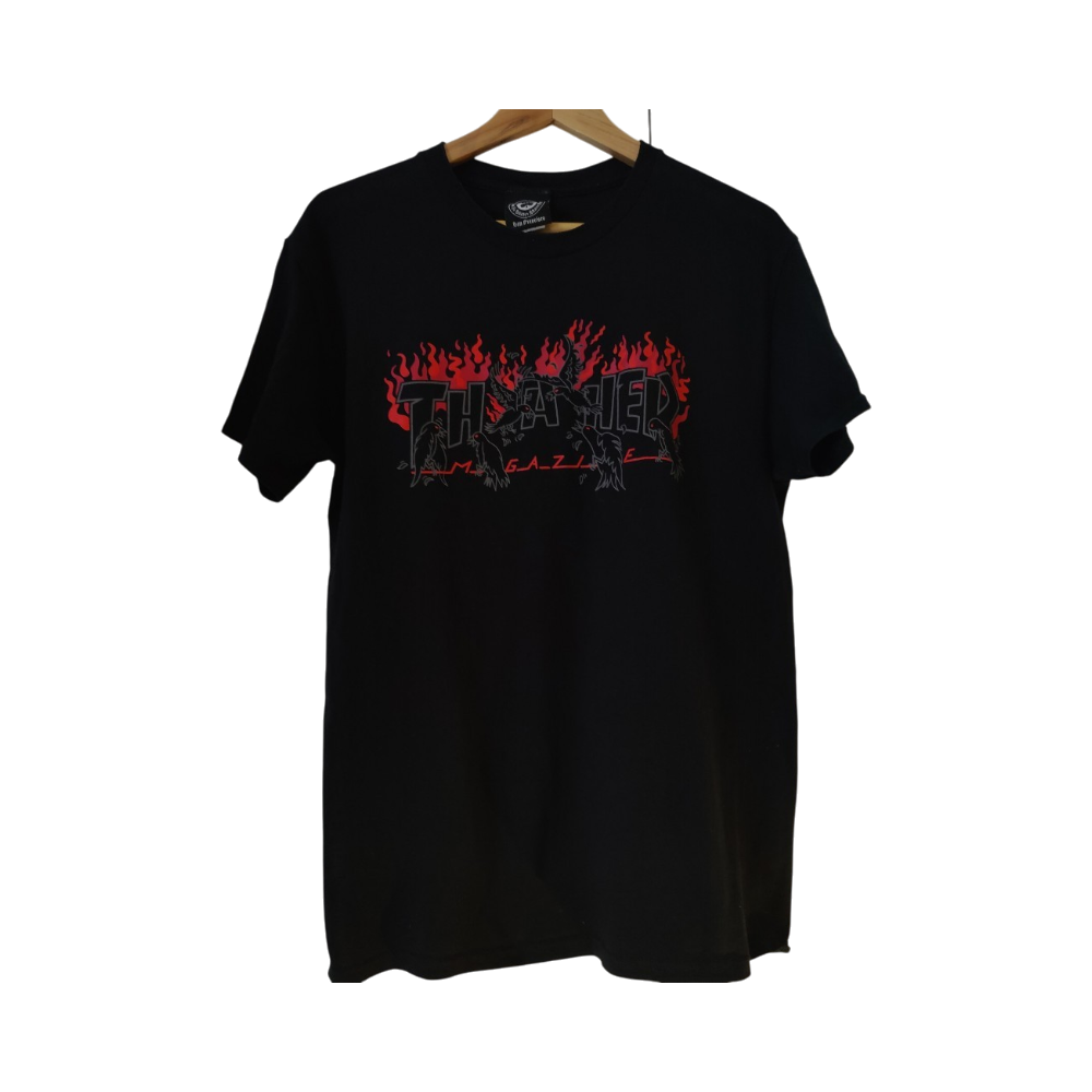 Mustassa skeittipaidassa punainen Thrasher-printti; hyväkuntoinen.