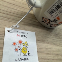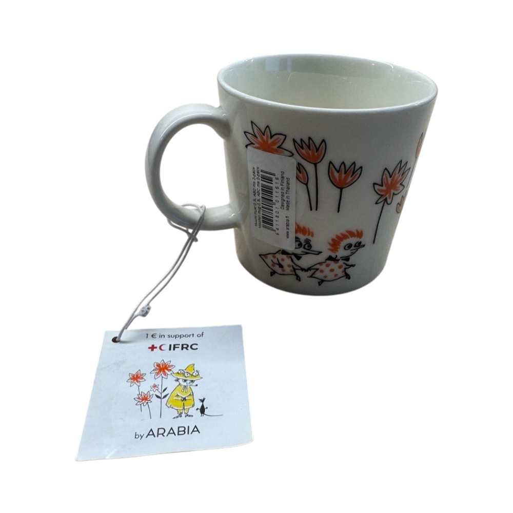Muumimuki on uutta vastaavassa kunnossa, eli se on käyttämätön, tarra on paikallaan ja Punaisen Ristin lappu on tallella.