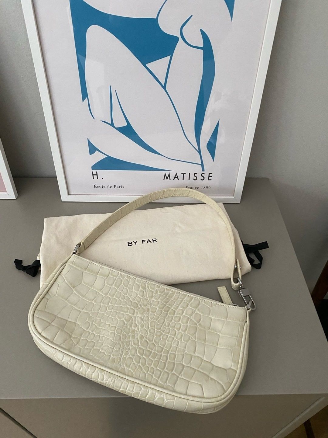 By Far Rachel laukku luonnonvalkoisella krokonahalla. Ovh 360€. Mukaan alkuperäinen dustbag. Sama laukku bongattu useaan otteeseen mm. Matilda Djerfin vaatekaapista