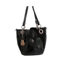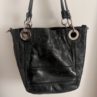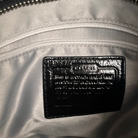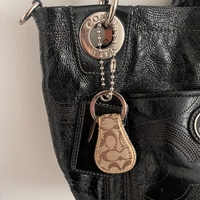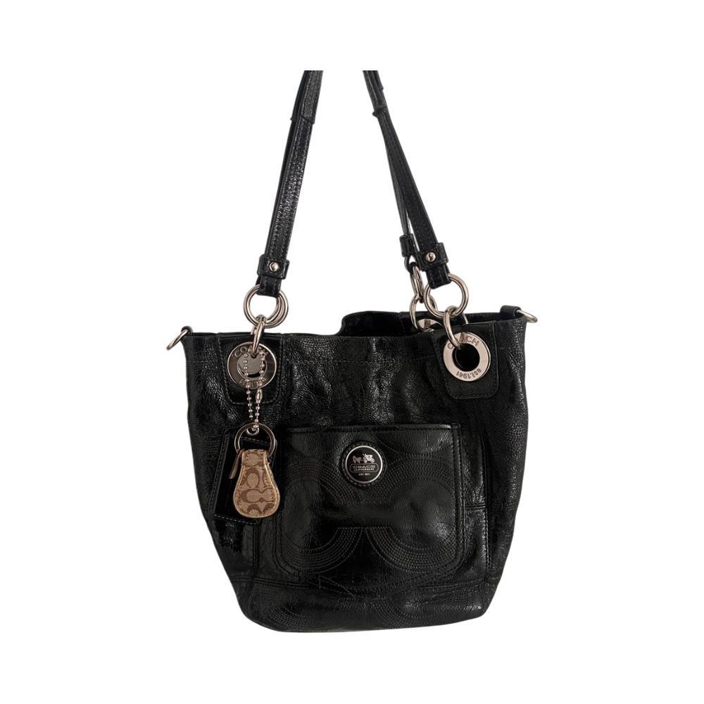 Musta kiiltävä coach-olkalaukku, hevonen-vaunu logo ja avainhihna.