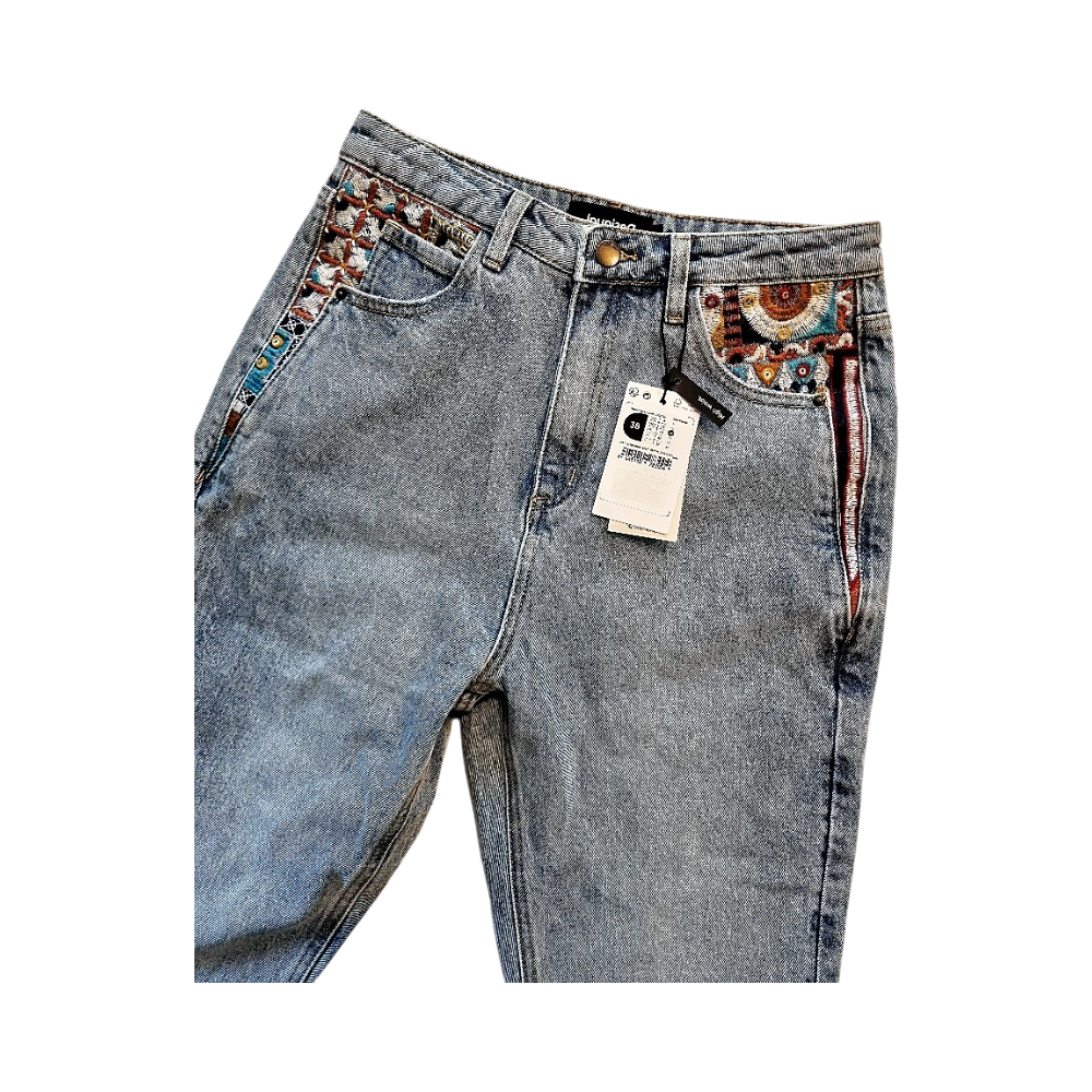 Desigualin nettisivujen kokotaulukon mukaan farkuissa 38 sovelletaan vyötärön leveyttä 71-74cm ja lantion kohdalla 97-100cm.