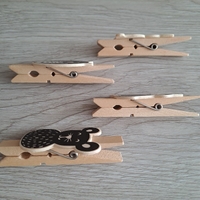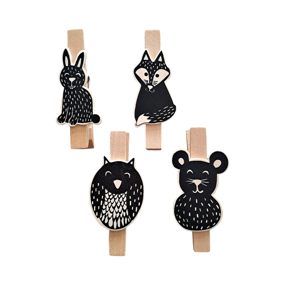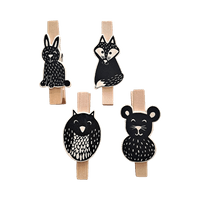 Neljä puista pyykkipoikaa eläinaiheilla.