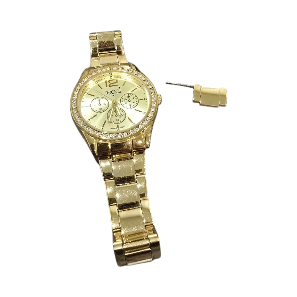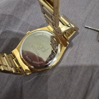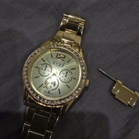 Kultainen naisten rannekello. Toimii mutta viisarit ei liiku. Täytyy vaihtaa uusi patteri.