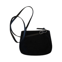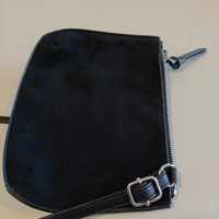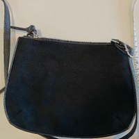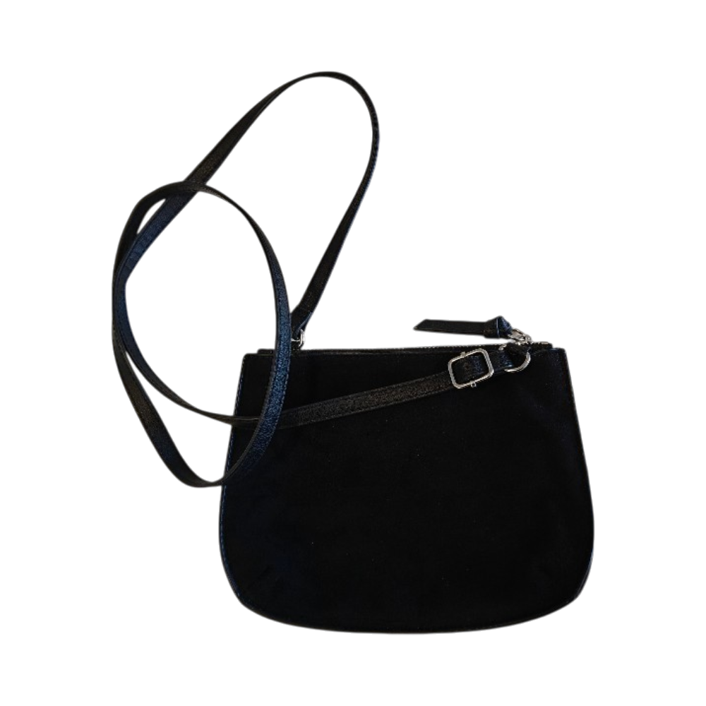 Musta crossbody-laukku, siisti ja monikäyttöinen. Toinen puoli mattapintaista mokkajäljitelmää, toinen puoli tekonahkaa.