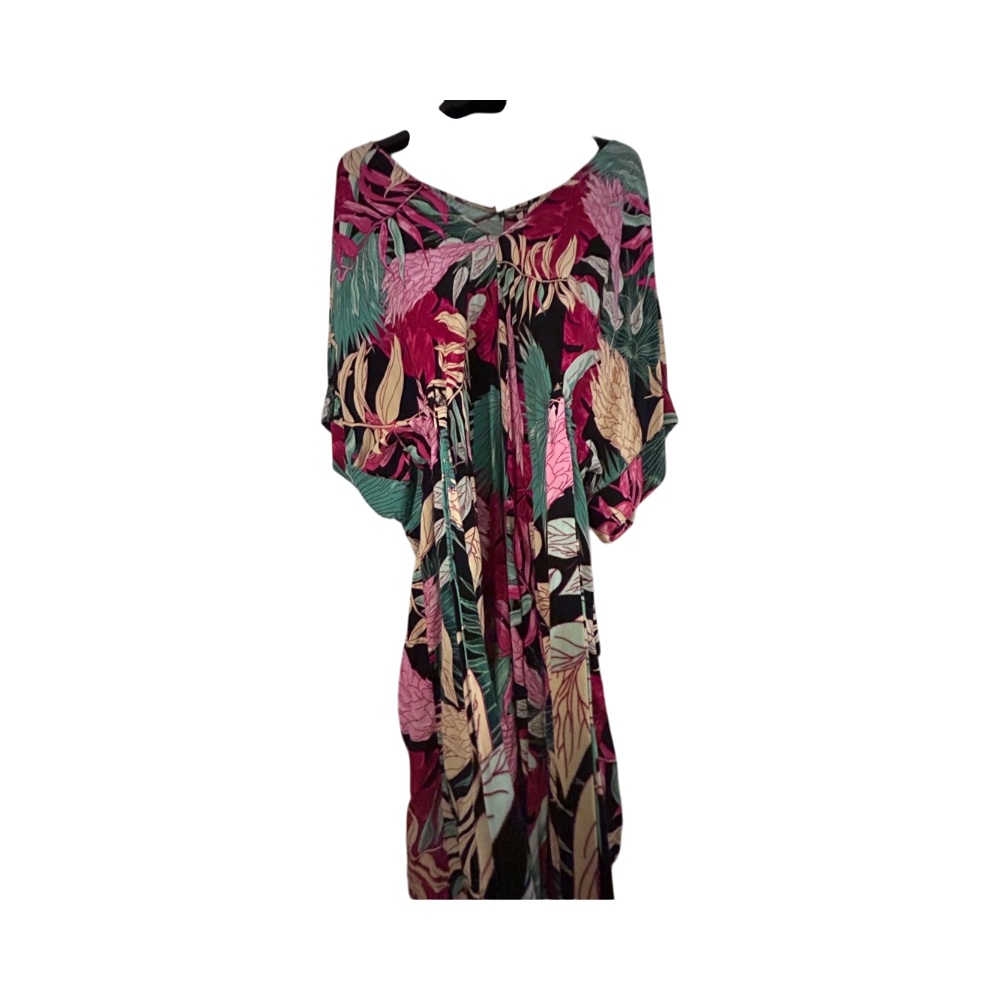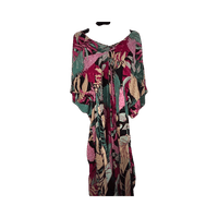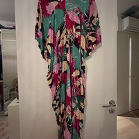 Värikäs pitkä mekko leveillä hihoilla ja vyöllä. Kaftaanityylinen. Reilua kokoa