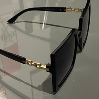 Chunky black frame with gold chain detail, gradient dark lenses. Some scratches visible.