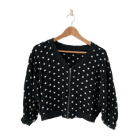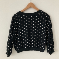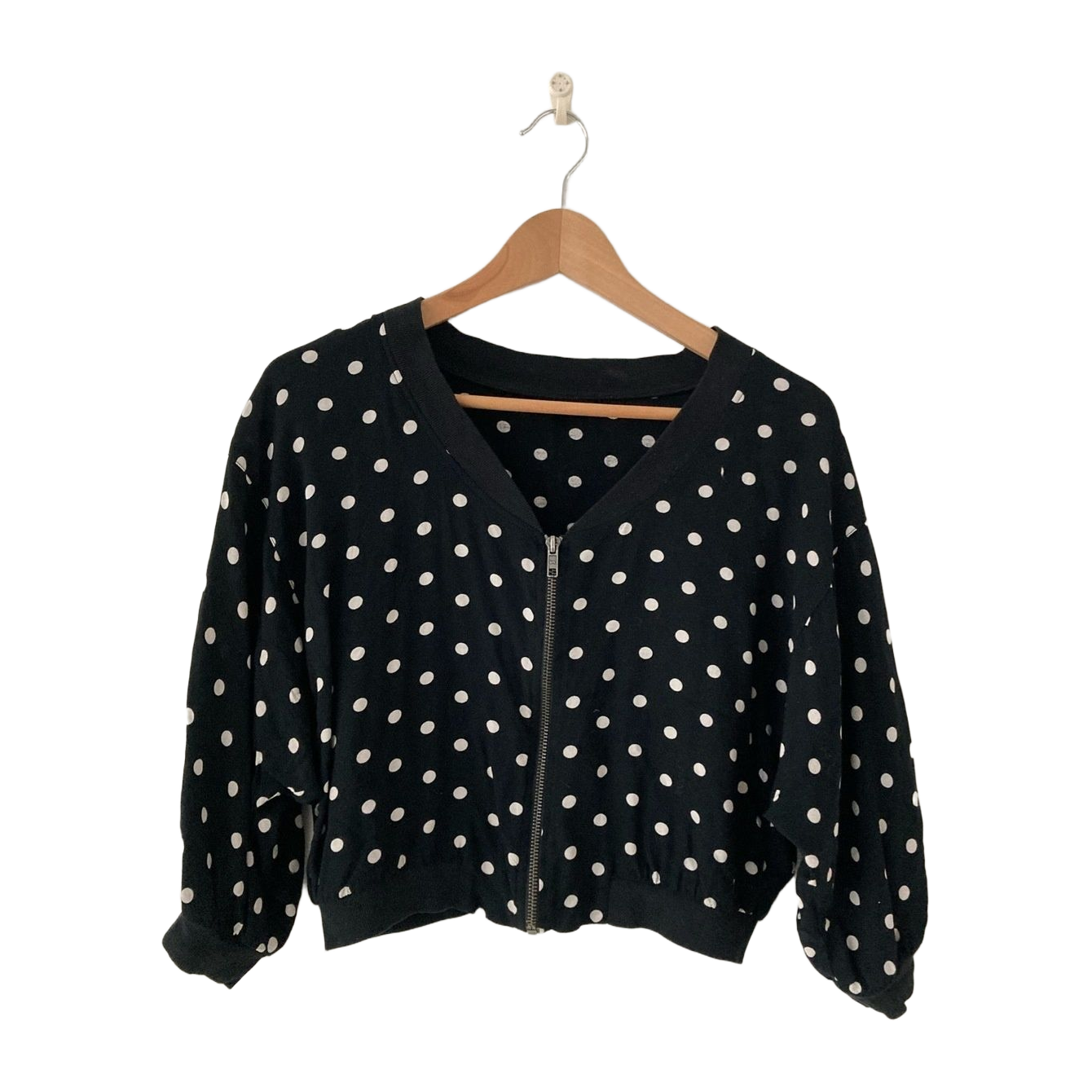 Myydään musta-valkopalloinen viskoosibomber 3/4 lepakkohihoilla. Vetoketju toimii todella hyvin. Toimii arjessa sisäpaitana ja juhlissa pikkutakkina/bolerona esim. mekon päällä.