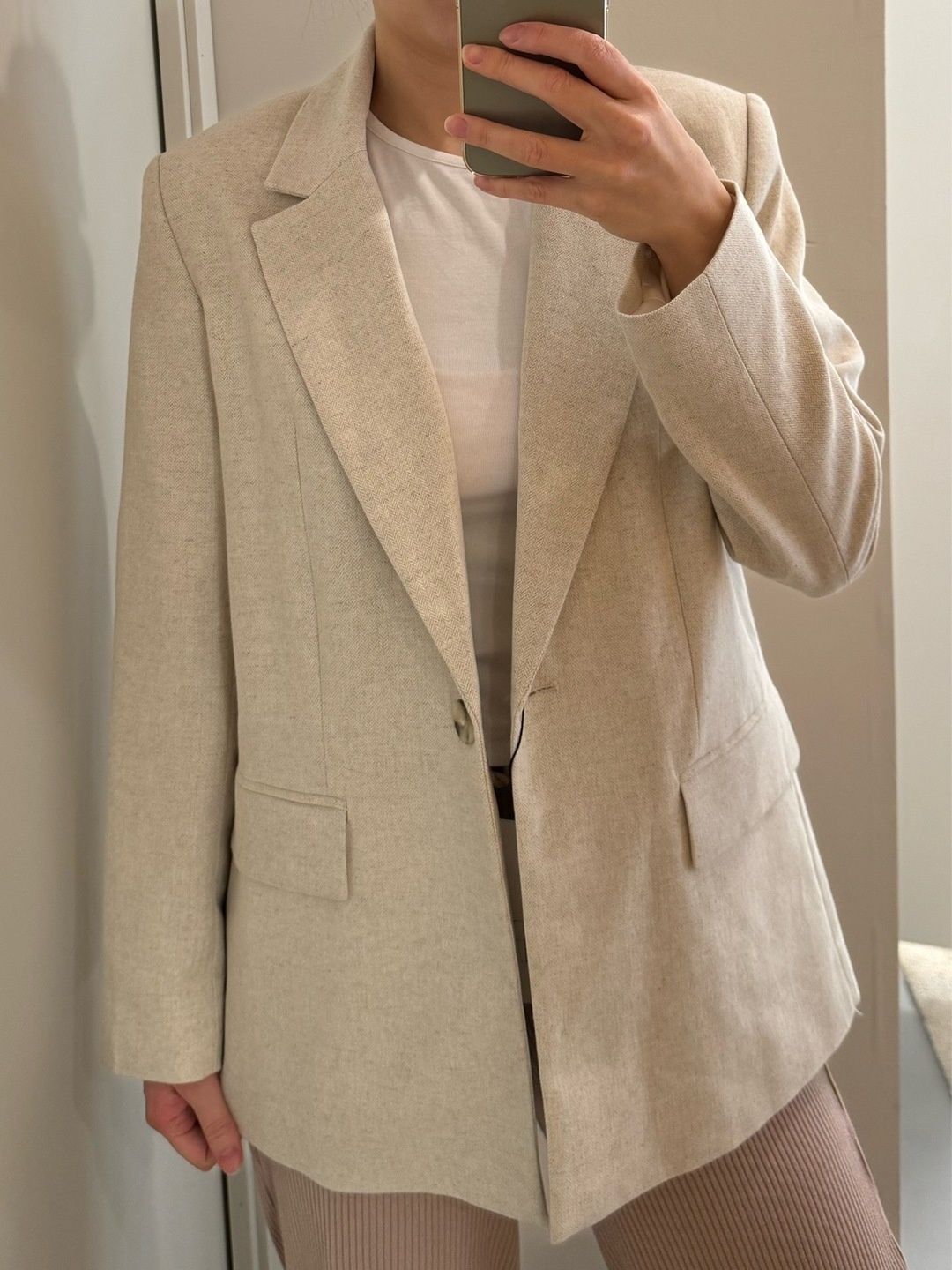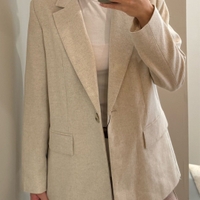Beige tvillikankainen bleiseri, m koko. Pitkät hihat, olkatoppaukset.