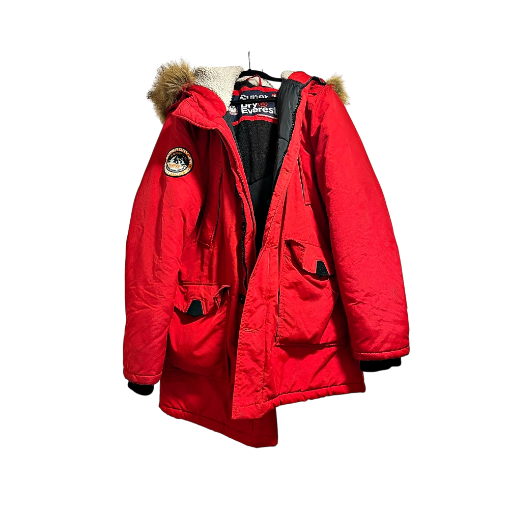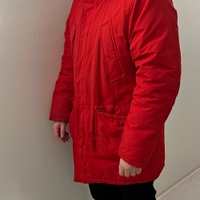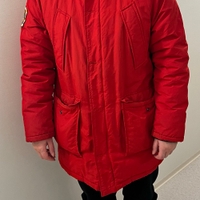 Hyväkuntoinen kirkkaanpunainen Superdry talvitakki. Vain vähän käytetty, takissa vetoketju sekä napit, sisällä vyötärön kohdalla kiristysnauhat joista kireyttä saa säädettyä. Koko Superdryn 3XL eli menee L kokoa käyttävälle miehelle. Täydellinen talvikeleihin, myös huppua saa kiristettyä.