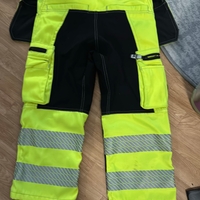 Korkeavisihoiset heijastinhousut työkäyttöön, taskuilla. Vähän likaa jääny ja hejastinta on kulunu