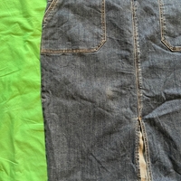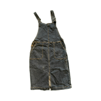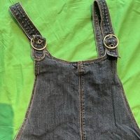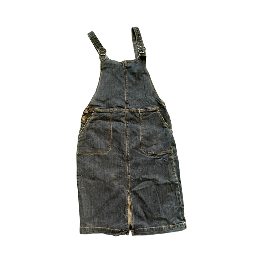 Sininen farkku haalarimekko, olkaimet ja etutaskut, midi-pituus. Halkio edessä.