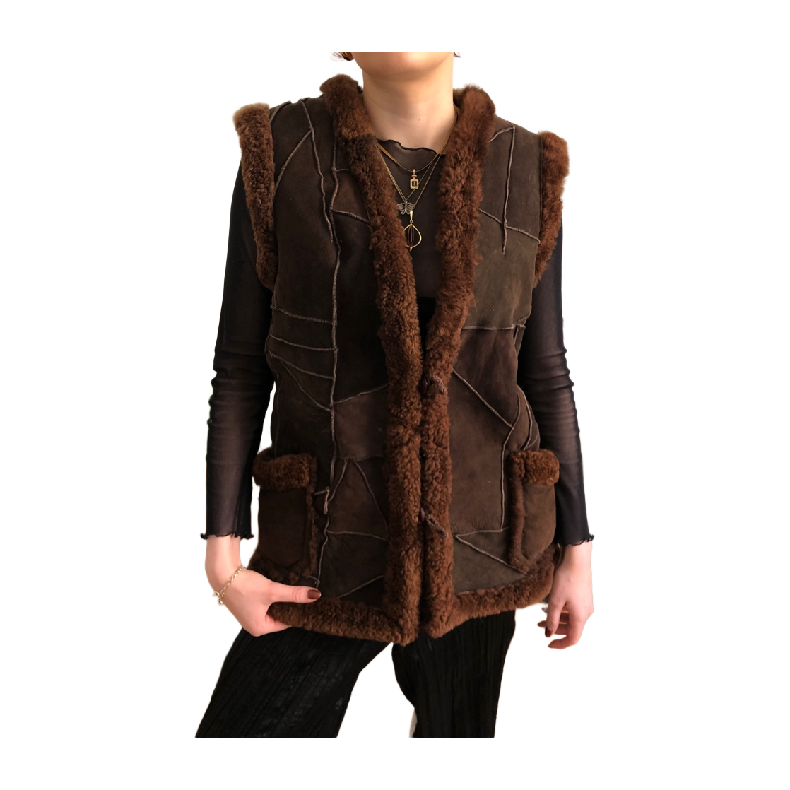 Vintage ruskea lampaan nahka ja turkis liivi, vastaa kokoa S/M. Voi käyttää molemmin puolin, tosi hyvässä kunnossa.