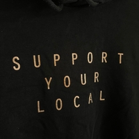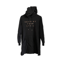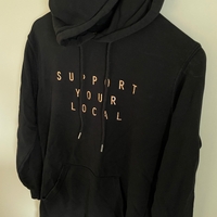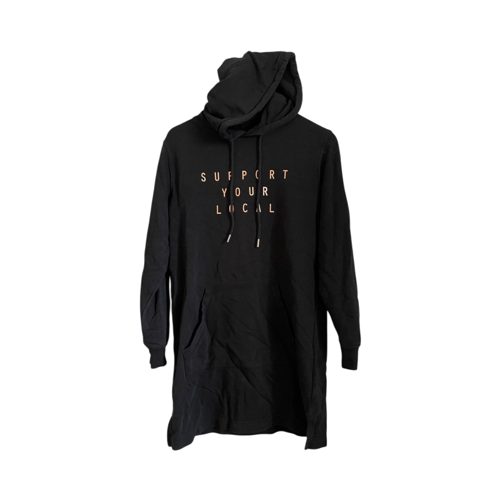 Pitkä musta huppari, ruusukultainen texti. Pieni koko!
