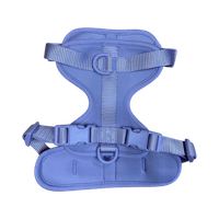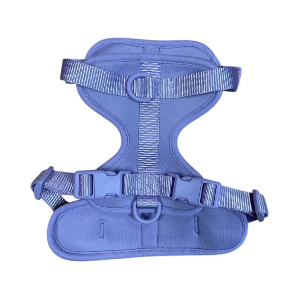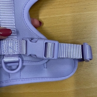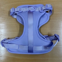 Padded adjustable lilac pet harness with buckle and D-rings. Neck 27-37 cm, chest/stomach 42-53 cm.