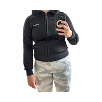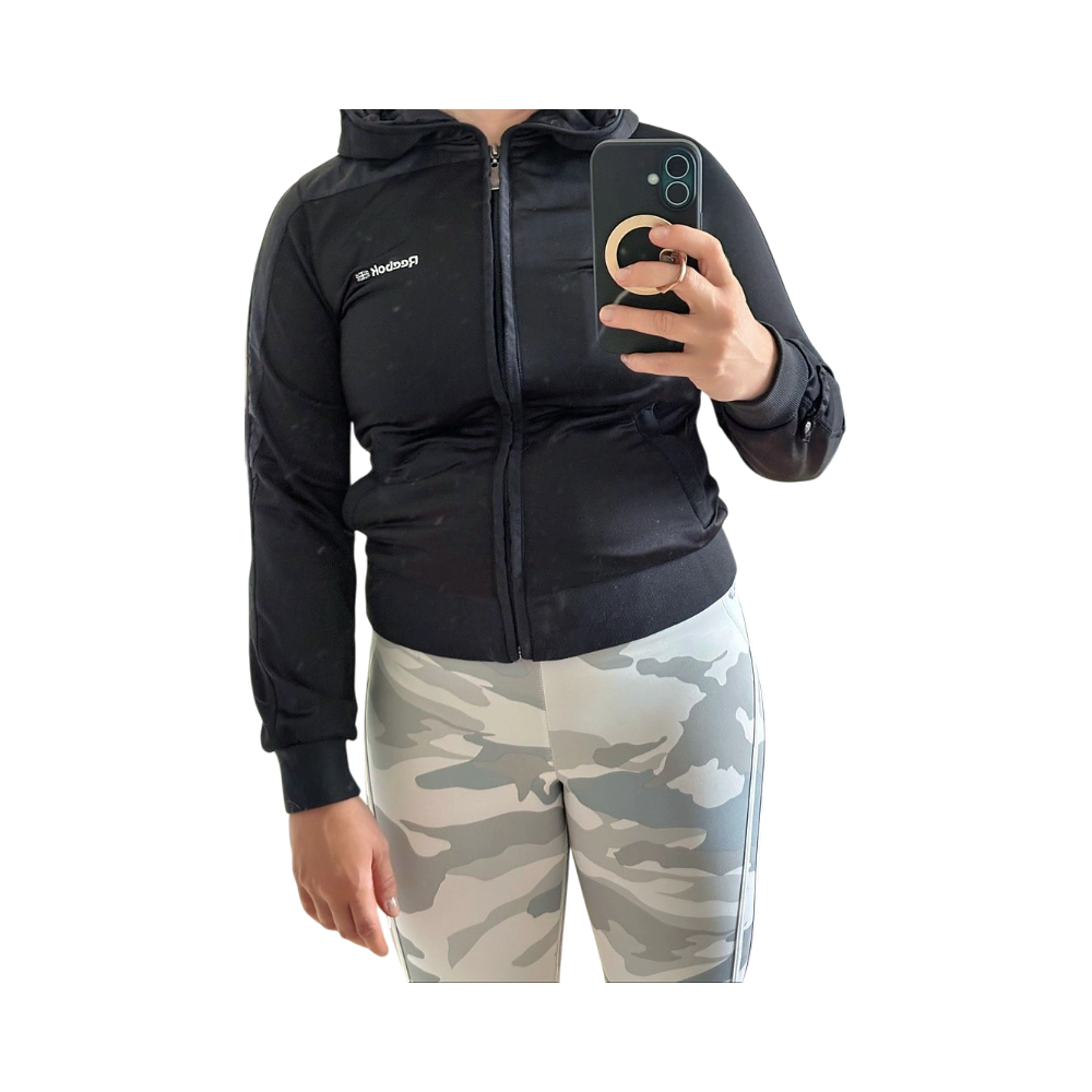 Musta vetoketjuhuppari, vetoketjulliset taskut, hyvä kunto, kunnon musta (kuva vähän vääristää), yksityiskohtia hihoissa eri kankaalla, sama kangas myös hupun sisuksessa. Muutamia kertoja pidetty.