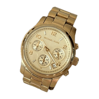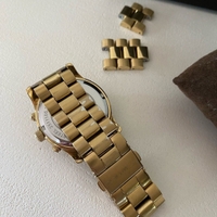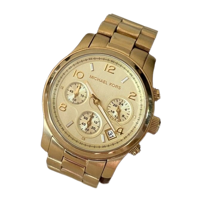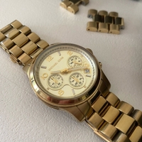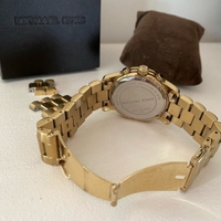 Michael Korsin kullattu MK5055-rannekello. Jonkin verran kulumaa kultauksessa ja kellotaulussa. Patteri täytyy vaihtaa (maksaa alle 10 €). Mukana vaihtopaloja/lisäpaloja.
