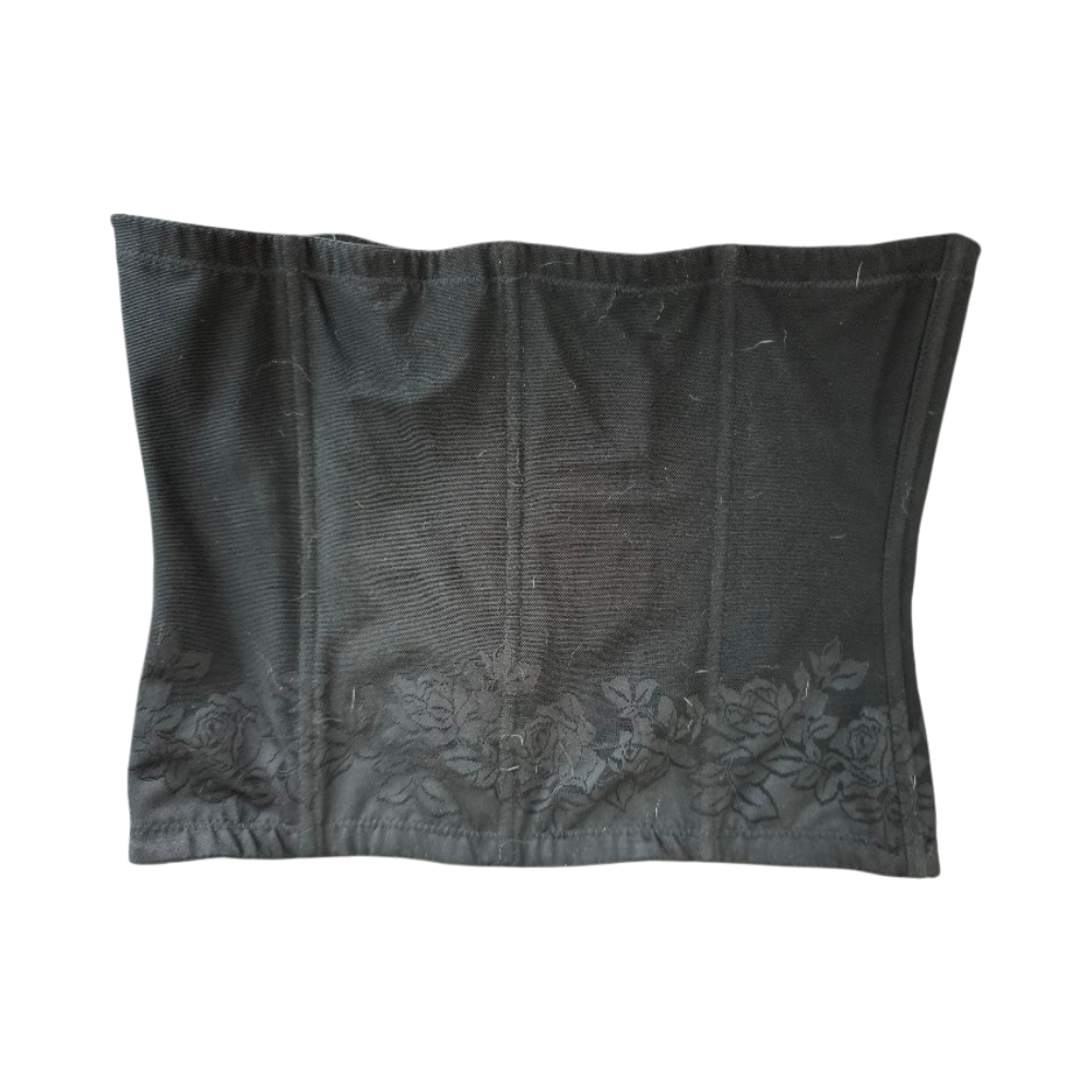 Muotoileva korsettivyö, takana hakaskiinnitys ja edessä kukkakuosi.