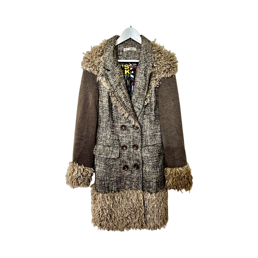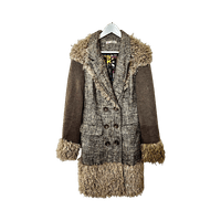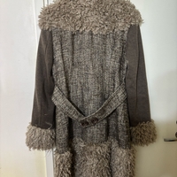 Ruskea villakangastakki, tekoturkisreunuksilla, napitettu malli.
