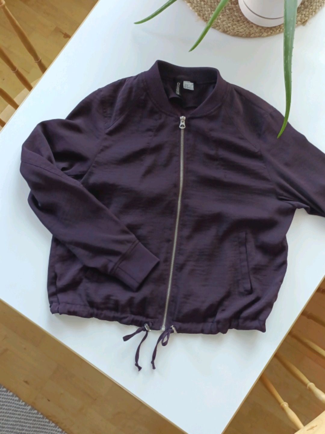 Pusakkamallinen takki/jakku. Väri tumman violetti ja kunto erinomainen. Edessä taskut ja vyötäröllä kiristysnauha.