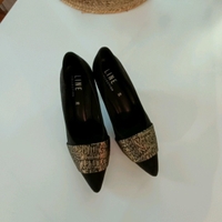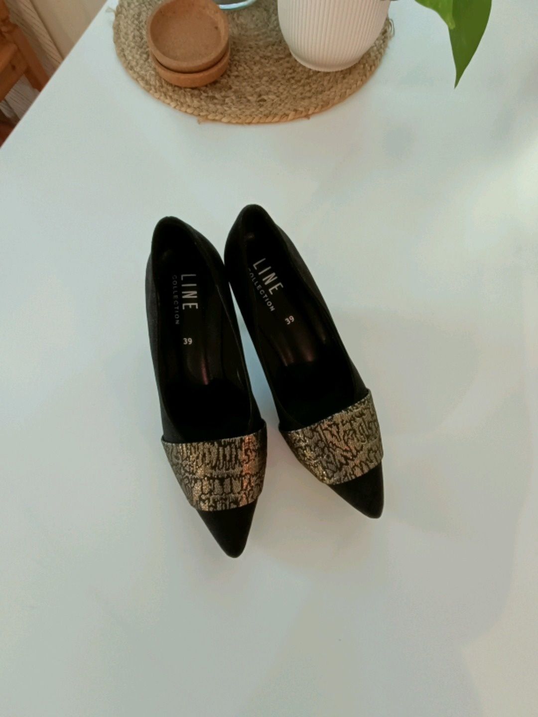 Mustat korkokengät kultaisella yksityiskohdalla. Koko 39.