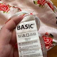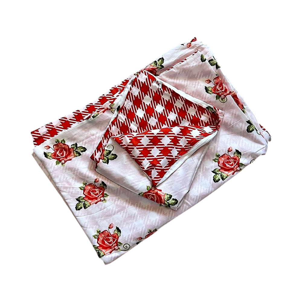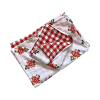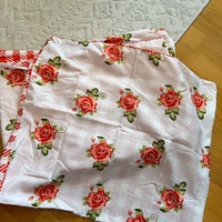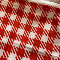 Ollut kerran käytössä, eli hyvässä kunnossa. Ihan pientä langannousua, josta kuva. Toisella puolella ruutukuvio, toisella kukkakuvio.