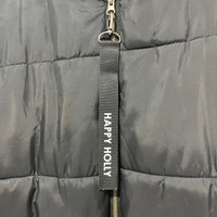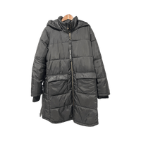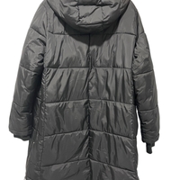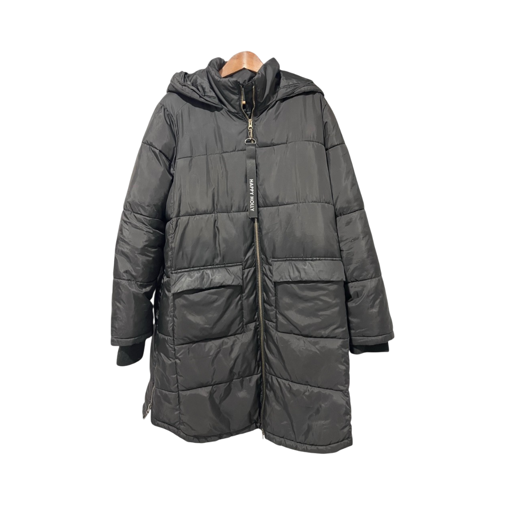 Pitkä, toppauksellinen talvitakki hupulla, vetoketjut ja taskut. Merkki Happy Holly koko 48/50 kai- kai 60cm olka-helma pituus 1m