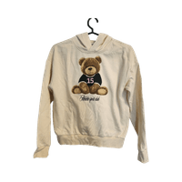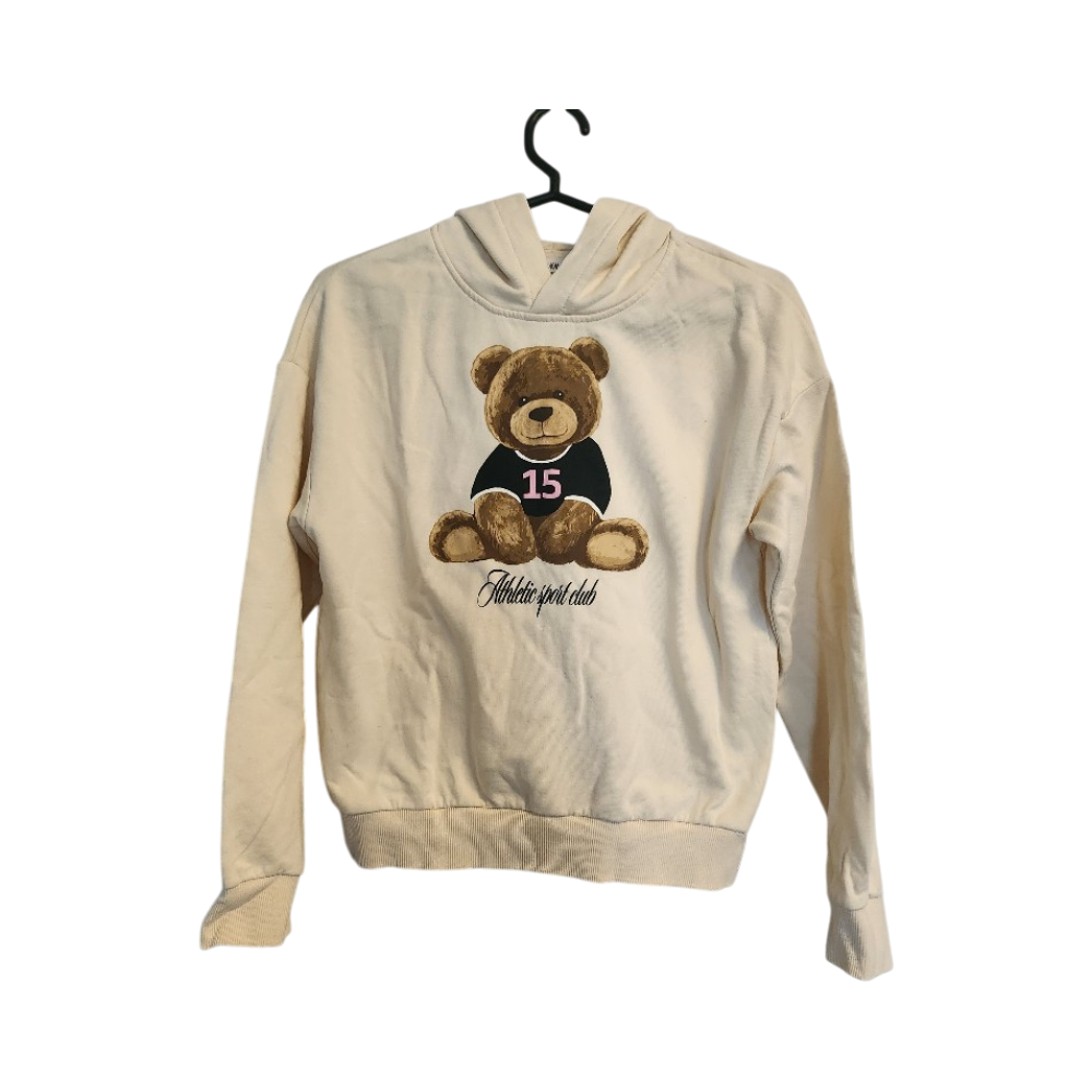 Beige huppari, etuosassa nallepainatus ja numerodetaili.