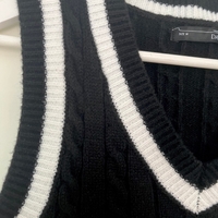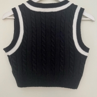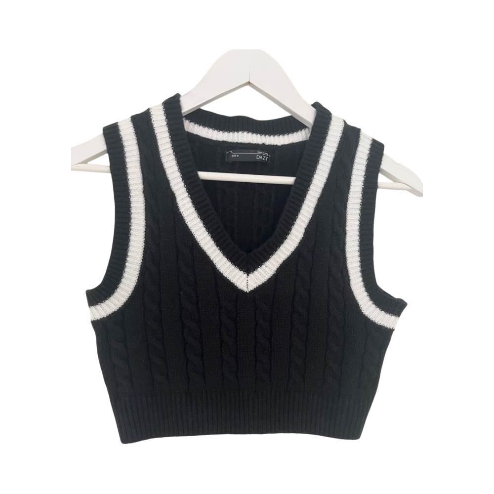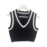 Cropattu palmikkoneuleliivi valkoisilla reuna-raidoilla. Erittäin hyväkuntoinen, ei nukkaantumista.