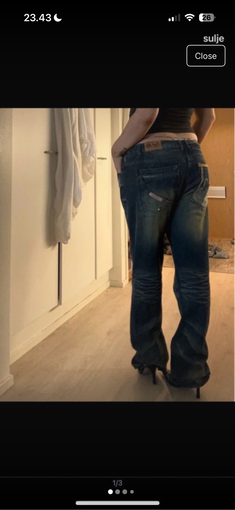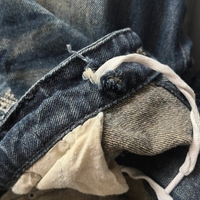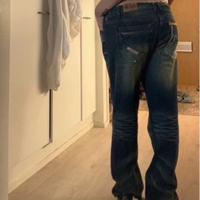 W34 kokoiset farkut. Farkkuihin on tehty itse tuollainen kiristysnauha, sen saa pois halutessaan. Farkkujen valmistaminen lopetettu. Vyötärönympärys 92cm ja pituus 109cm.