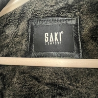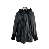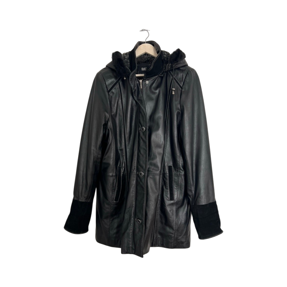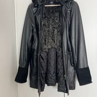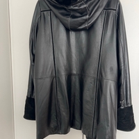 Musta pitkä nahkatakki, karvavuori ja huppu, käytetty. Helmassa kulumaa näkyy kuvassa. Takissa ei ole kokomerkintää, kokoarvio L-XL