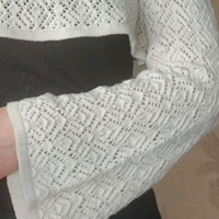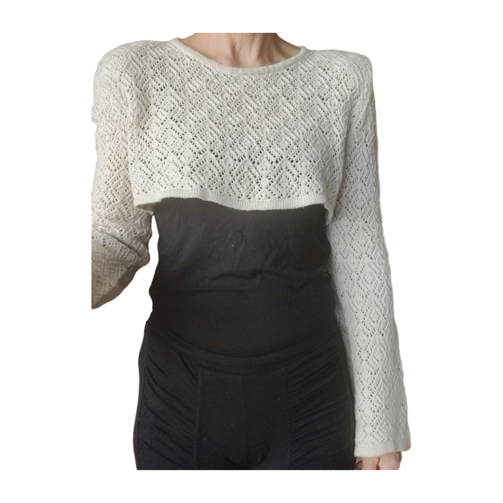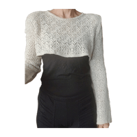 Lyhyt pitsineule olkatoppauksilla, levenevät hihat. Neuleessa ei ole kokomerkintää, on kokoa S/M. Tuotteessa ei materiaalista merkintää. #lace #knit #bell sleeve #vintage