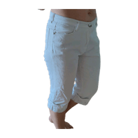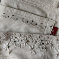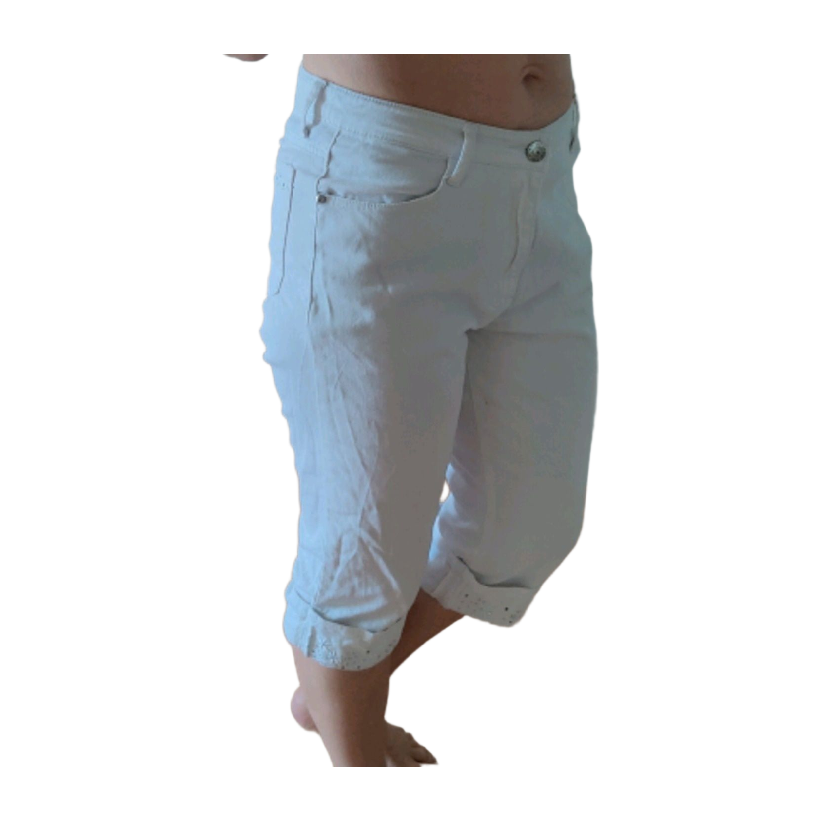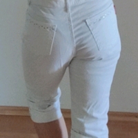 Valkoiset caprit, upslaakit. Brooderaus ja strasseja lahkeiden käänteissä edessä sekä takataskujen yläreunassa. Strasseja on irronnut, näkyy tummina koristeina. Kokomerkintä 42, on lähinnä kokoa 38-40, vyötärön ympärys 75 cm.